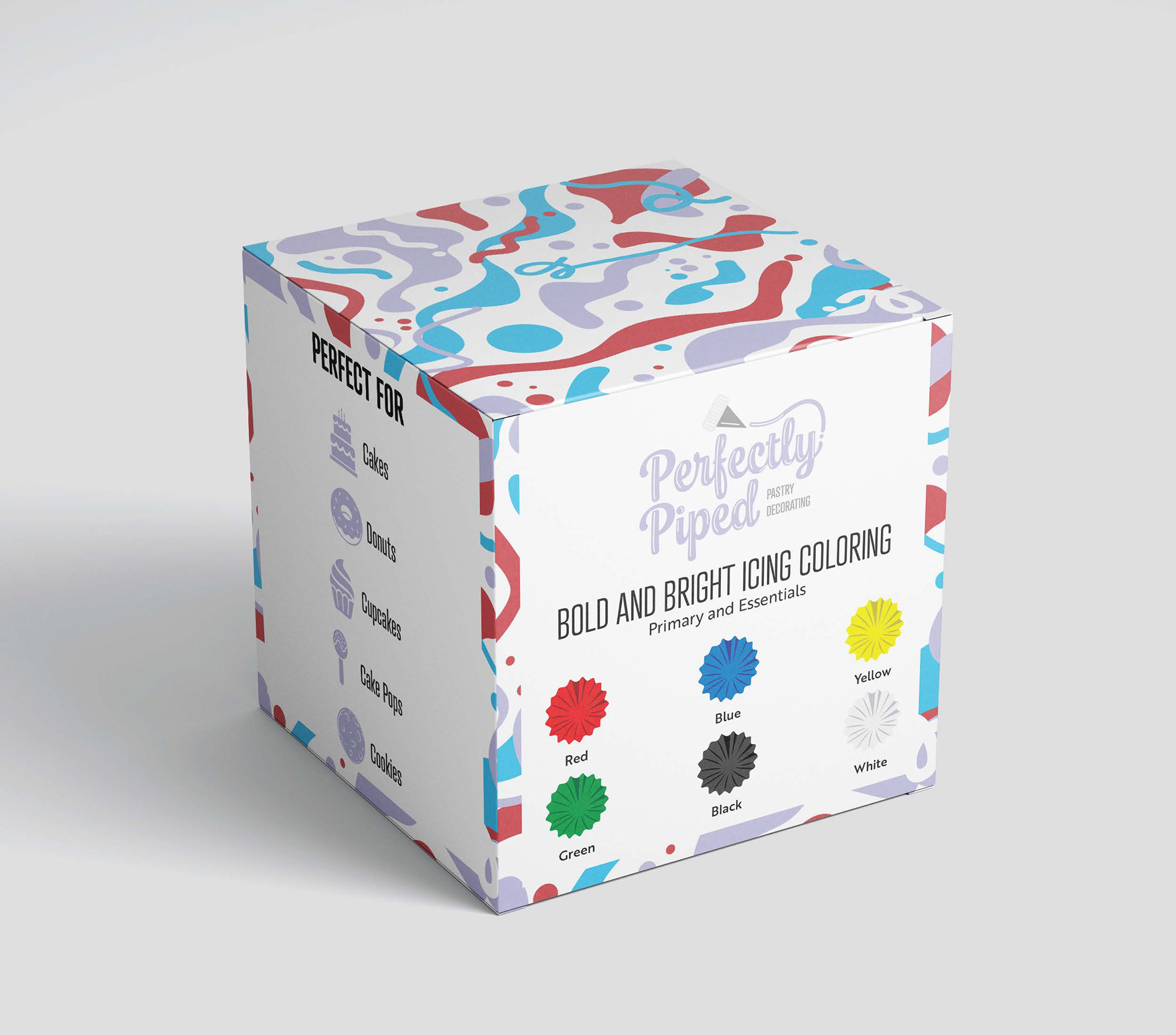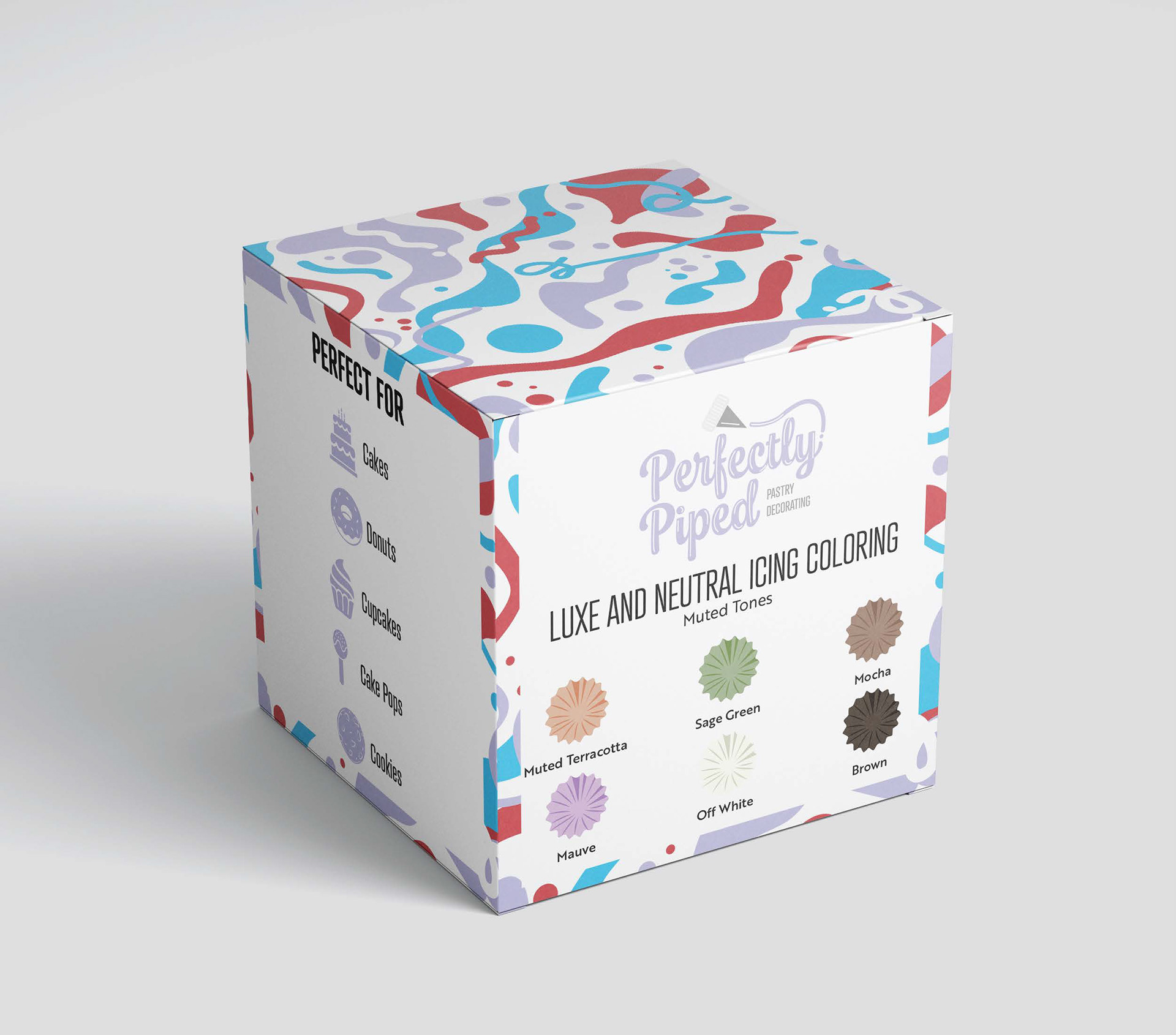 A vibrant, personality-driven design for Perfectly Piped’s food coloring kits—featuring bold and bright shades, sweet and soft pastels, and luxe neutral tones—created to inspire creativity while feeling polished, playful, and premium.
